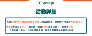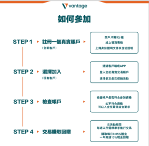 參與Vantage的獎勵活動,讓您的投資之旅更加精彩。信用獎勵雖然不能直接提現,但它們是您投資資本的強大助力,助您以低成本獲取高收益。